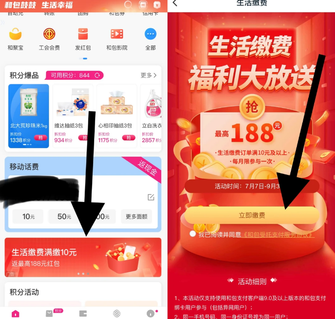 截止到2024年9月30日,每月在和包APP交水电燃气费10元以上,可领取最高188元现金红包!