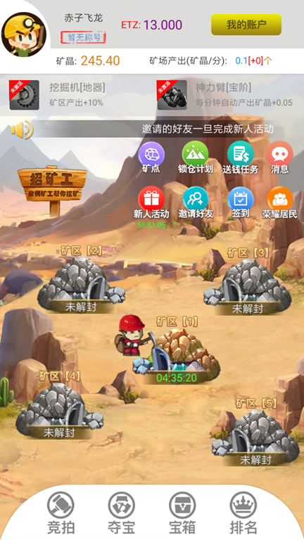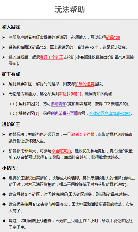 初入游戏 注册账户 时若有好友提供的邀请码 391466,必须输入,可以获得矿晶*30 系统初始赠送矿晶*15,算上邀请码的,合计共45个,这是起步资金。 进入游戏后,赶紧雇佣1个矿工去挖矿(小客服建议直接出价矿晶*10直接买断)。