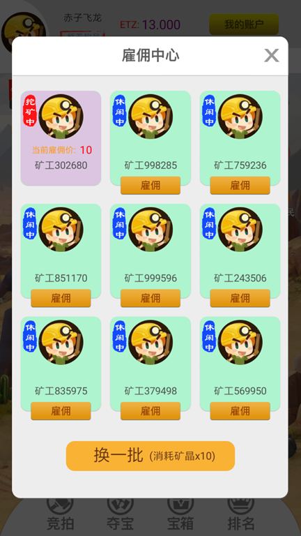 注册进入游戏后,立马花10个矿晶去雇佣矿工挖矿,一天妥妥收益48个矿晶。
