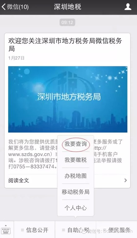 第一步:关注“深圳地税(shenzhendishuiju)”公众号
