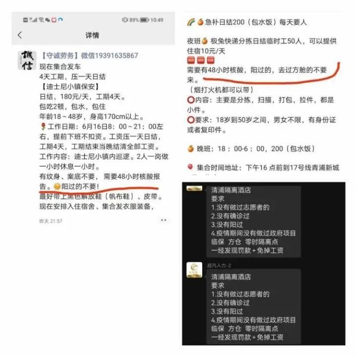 陈峰一边“流浪”,一边也通过劳务市场、微信群的招聘信息,想要在上海找一份临时的工作,但让他没想到的事情发生了。在他加的几个微信群里,不管是电子厂、还是保安、快递分拣员等,都在招聘要求里写到:“阳过的不要、进过方舱的不要。”