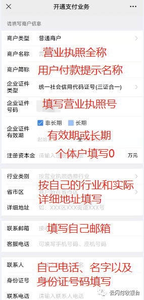 无营业执照的商户请选择小微商户(下图左),有营业执照的商户请选择普通商户(下图右);小微商户的商户名称必须填写为商户_姓名,否则无法通过审核和微信认证,比如商户_张三;普通商户的商户名称必须填写为营业执照名称;商户简称请填写实际店铺门头名称(客户付款成功后会在账单中显示);详细地址填写为实际收款常用地址;客服电话填写负责人的常用手机号,售后专用;备注可不用填写。