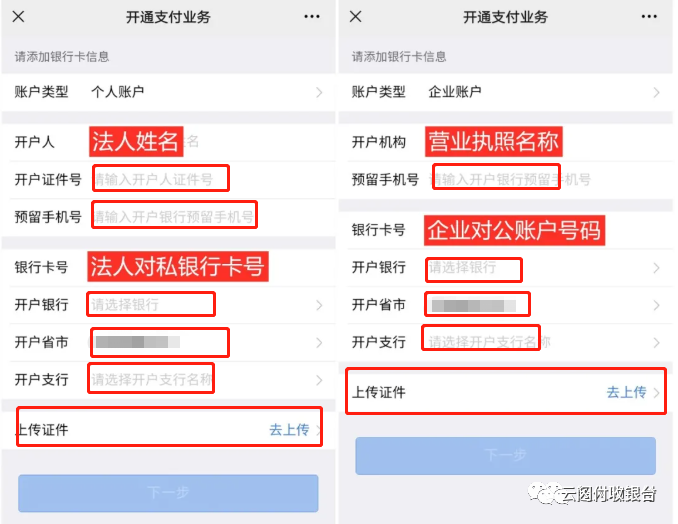 小微商户以及普通商户需要对私入账,请选择个人账户(下图左),即法人对私银行卡;普通商户需要对公入账,请选择企业账户(下图右),即企业对公账户;如果查询不到开户支行名称,请选择所在地市的分行