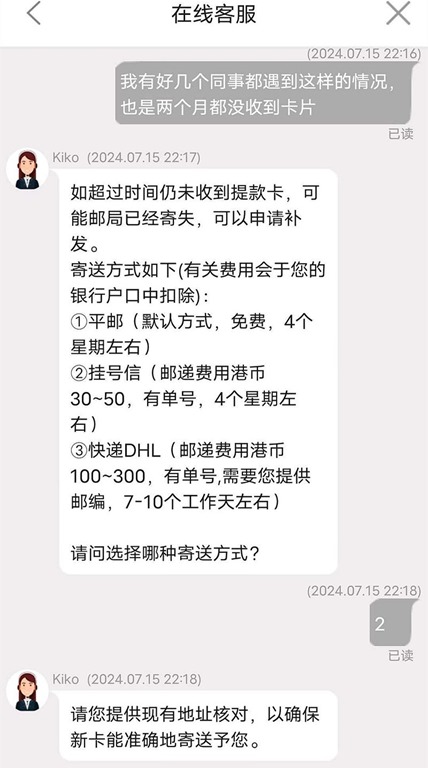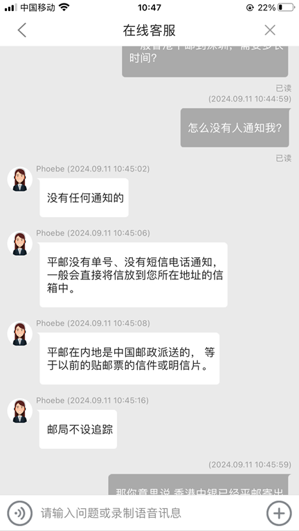 经过一个月长时间30天等待,确定香港到深圳的平邮中银香港实体卡片丢件,本人无法收到,没办法只好重新找中银香港人工客服反馈补卡。