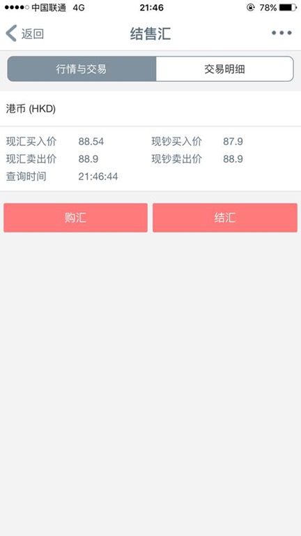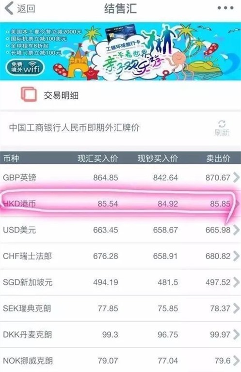 4、结售汇页面会看到很多币种在当天的买入卖出价。选择港币。