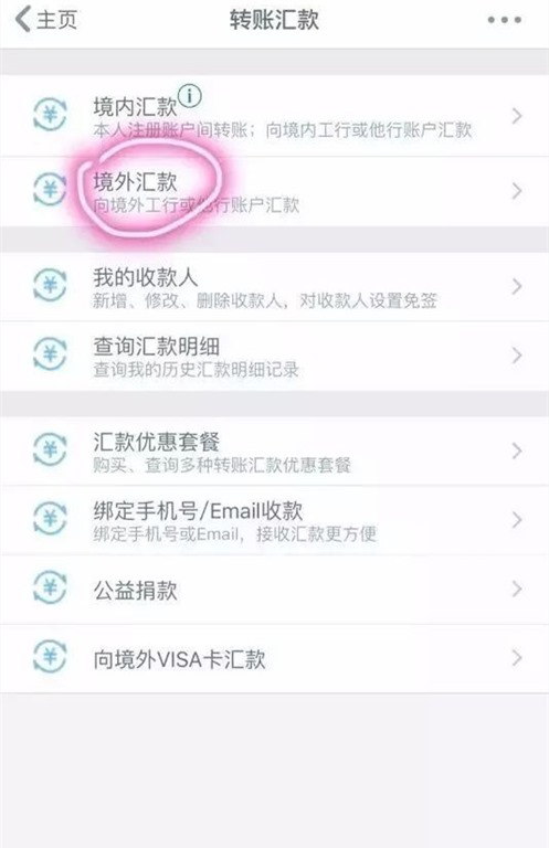 (4)完成购汇之后,我们就回到主页面。点击转账汇款--向境外账户汇款。