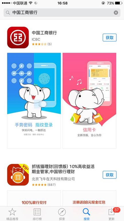 2、客户在自己的手机上应用市场,根据需要搜索并安装“中国工商银行”这个软件: