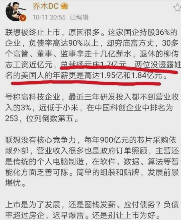 作为一个负债90%的企业,高管集体涨薪,却推迟员工的薪资调度,难道联想真如网友说的那样“不取消员工的年终奖,怎么给高管提工资。”,如果真是这样,这和封建社会吸人血的地主有什么区别呢。或许司马南给联想下的资本家的定义,没下错?