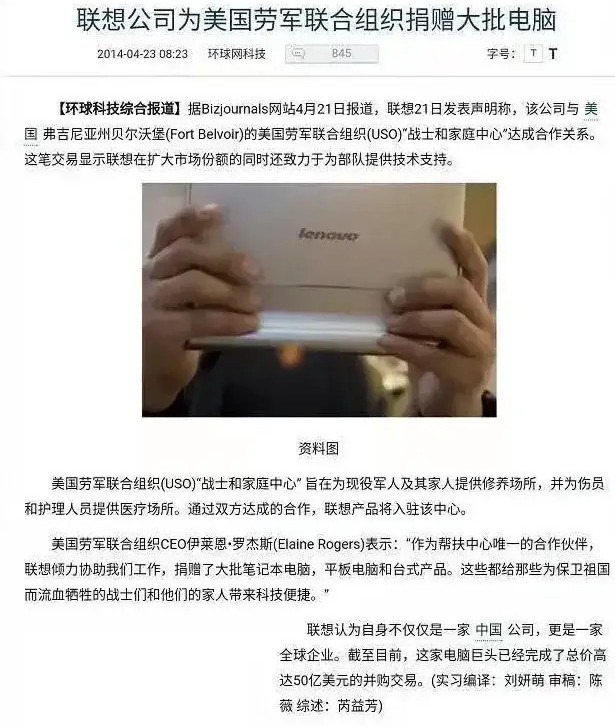 但就是这样一家企业,在2014年向美国劳军联合组织下属的一个“战士和家庭中心”捐赠了大量的电子产品,主要是笔记本电脑、台式机、平板电脑。或许当时的联想已经忘了当初岌岌可危的台海危机,也忘了那时间和台海危机的日子高度重合。