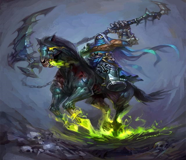 灰马骑士或者说绿马骑士是四个其实中唯一一个标注了名字的骑士,它在圣经中明确记载为“死亡”,不过关于它的马的颜色人们有一些争议,因为希腊语中khlōros一词不仅指苍白色,还指灰绿色和黄绿色,因此不少人认为它是绿马。