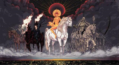 《启示录》中揭示了人类灭亡的场景,在世界终结之前会有羔羊揭开“七印”随之而来的有“七号”、“七碗”的灾难,而后是审判日的到来!其中前四印分别代表瘟疫、战争、饥荒、死亡的天启四骑士。这些令人畏惧的神秘形象,一直为中世纪欧洲的文学作品蒙上了悲凉和恐怖的阴影。