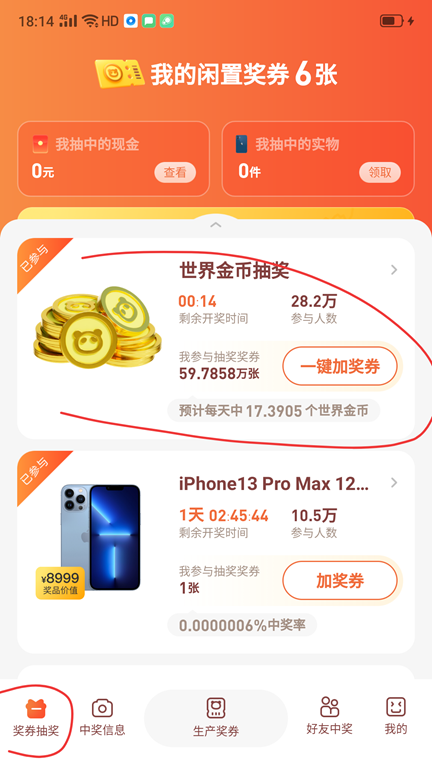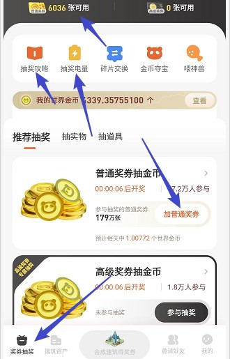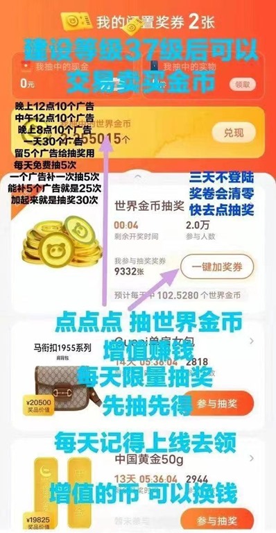 1、有时间记得检查闲置的奖券,一键投入到世界金币抽奖里面去挖币,不要浪费--分一秒,有闲置奖券就投进去。