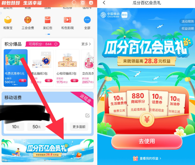 好福利,中国移动《和包》每月直接领1000积分!每月免费拿最高880商城积分,商城积分兑换实物获取收益!