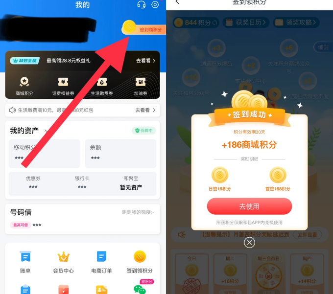 活动路径:和包APP我的界面点击商城积分