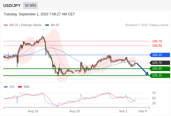 在 106.10 之下,看跌,目标价位为 105.50 ,然后为 105.20 。