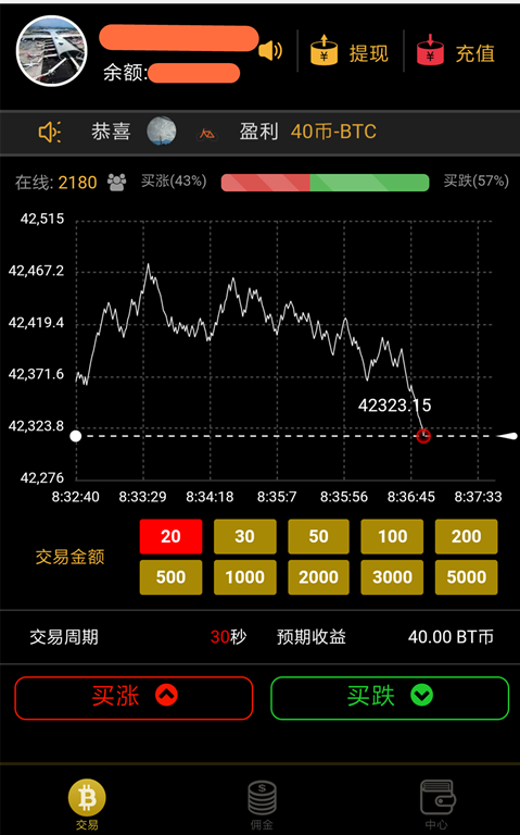 本平台以“RMB”作为交易单位,每1笔交易为20元,每次交易最少下单20元,最多下单5000元。本平台以“秒”作为结算单位,交割周期分为30秒、60秒、120秒,分别为80% 85% 90%收益