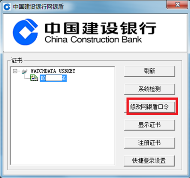 网银盾密码需要插入该网银盾后,双击打开电脑右下角的建行银盾管理工具,通过“修改网银盾口令”操作。