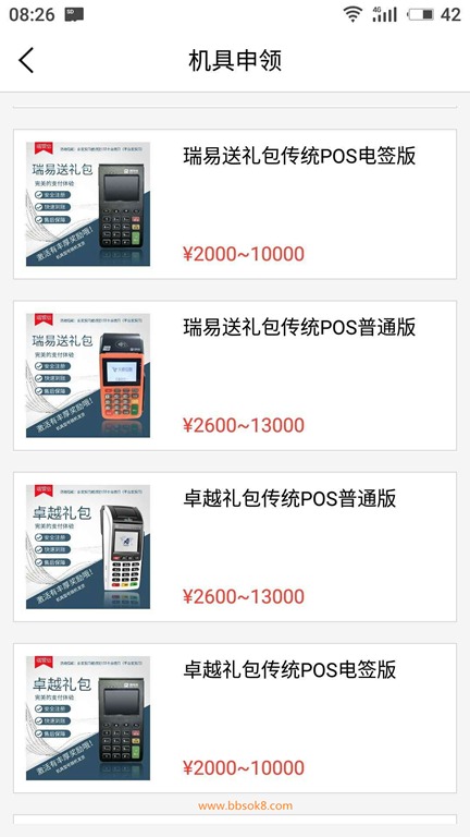 现在瑞联盟有几种机型款式,比如传统POS机电签版、传统POS机普通版等,电签版比较小巧,传统大POS机是有出小票的,有白色、橘黄色等颜色选择。