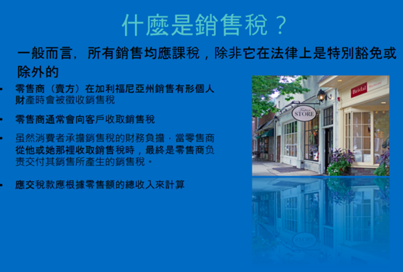 销售税不归美国联邦管,IRS不征收销售税。大部分州都设有销售税或者使用税,州下辖的县、市或税区可能还会征收额外的销售税或者使用税,销售税实际上是各个州政府的主要财政收入来源。消费者是实际纳税人,商品出售方或者服务提供方仅仅是代政府征收销售税,之后要上缴政府部门。各州对零售销售税率的规定各不同,有的州甚至没有零售销售税。