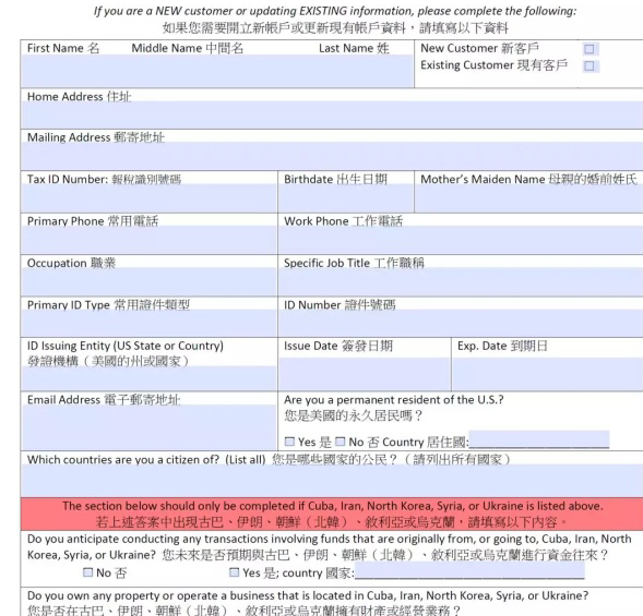 2.填写开户申请表。客户经理会将开户申请表发至指定邮箱。申请表填写完毕后,连同护照个人页、身份证正反面、名片的扫描件(或者照片)一起发给客户经理。申请表样式如下: