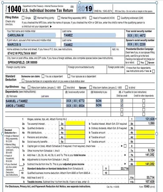 美国2019 IRS 1040 2019年税务数据 美国三县技术学院个人报税表参考