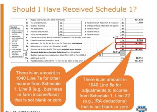 您可能会被要求为您的 1040 提供时间表 1,2 和/或 3。下面的示例将说明是否存在任何或所有时间表。