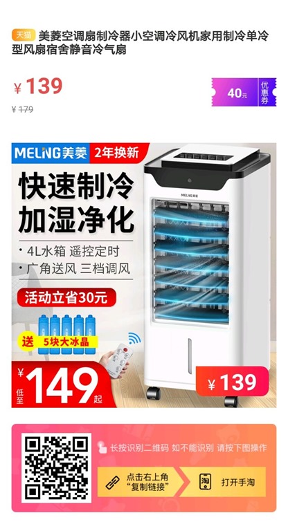 美菱空调扇制冷器小空调冷风机家用制冷单冷型风扇宿舍静音冷气扇 ,带遥控器 ,原价179,【券后价】139元,极速降温,凉爽夏季! 2019年7月11日15:51:06 发表评论 5,275 次浏览 美菱空调扇制冷器小空调冷风机家用制冷单冷型风扇宿舍静音冷气扇 ,带遥控器 ,原价179,【券后价】139元,极速降温,凉爽夏季! 【价格】179元【券后价】139元 --------走着 ,(CZnmY6tqxbH),打开(Tao)即可 手机浏览器扫码,支持Tao扫码,马上购买美菱空调扇带回家,极速降温,凉爽夏季! 赞 0 赏 分享