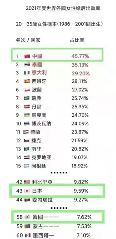 2021年世界各国女性婚后出轨率,中国女性世界第一