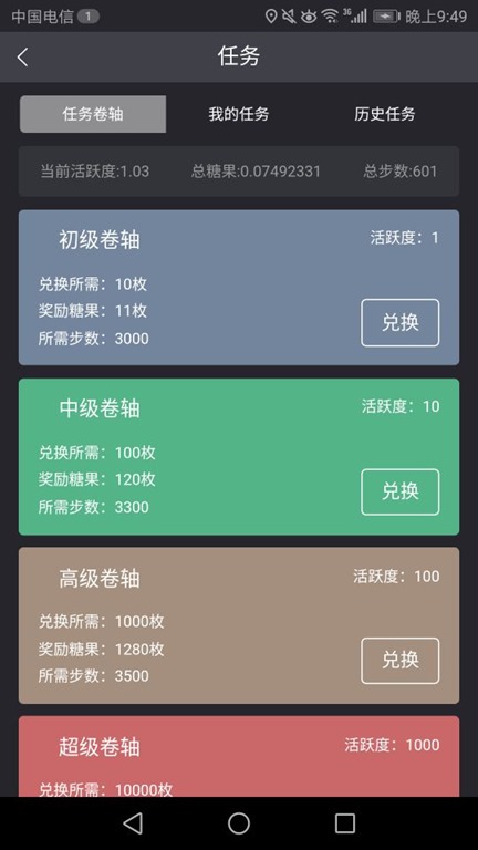 在趣步APP里面只要每天坚持运动就可以持续获得糖果进行售卖!(有任务卷轴的状态下,新用户注册系统自动赠送试炼卷轴,后面会细讲)