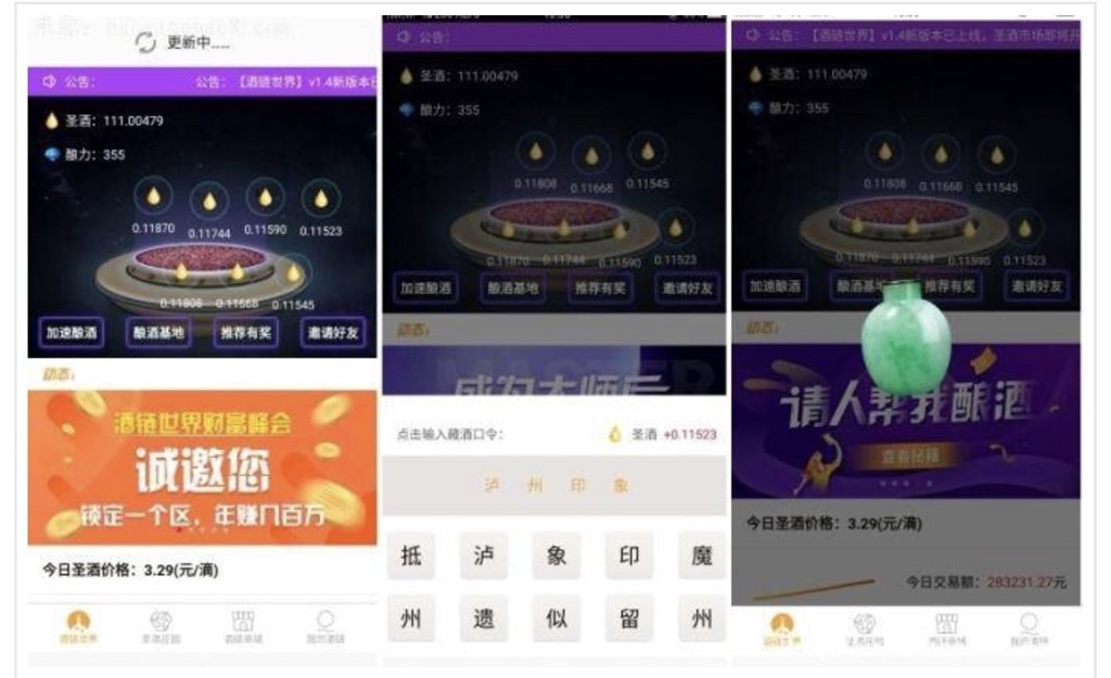 酒链世界,它现在是中国第一个酒类区块链落地应用项目,就是你用手机酿圣酒,圣酒(Token)现在价格是3.3元/滴,每月大概可以酿100-300滴酒,到年底大约是20—30元/滴,未来上涨空间还是很大的。