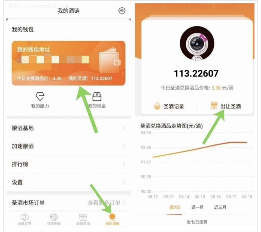 四、创建好钱包,设置交易密码就可以进行交易了,点击”我的酒链”,再点击”出让圣酒”。