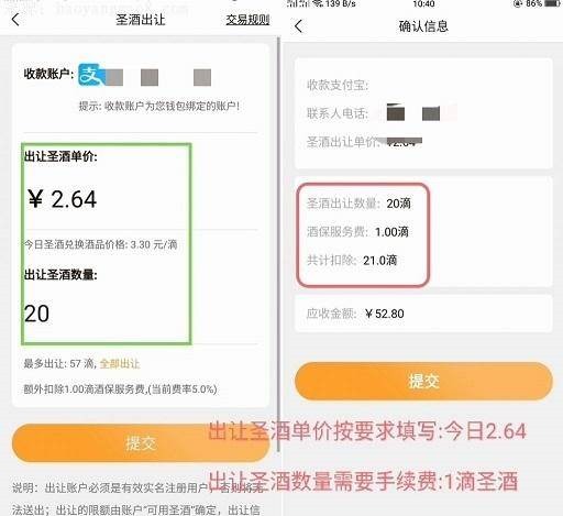 五、按照要求操作填写需要出让的圣酒数量和单价就行了,等有人购买你出让的圣酒,就直接打款到支付宝中了,如果截止当天晚上21:00前还没有人购买就会取消订单,明天可以继续出让。