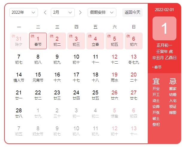 2022年春节:阳历2022年2月1日 正月初一壬寅年 虎辛丑月