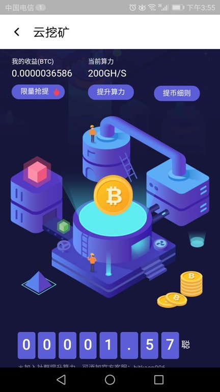 注册送200的挖矿算力,邀请再送50算力,每天可挖取一定量的BTC,算力越高挖取越多。