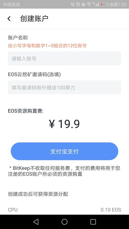 开通EOS账号 需要支付宝支付19.9人民币 价格合理 给用户的福利 成本价