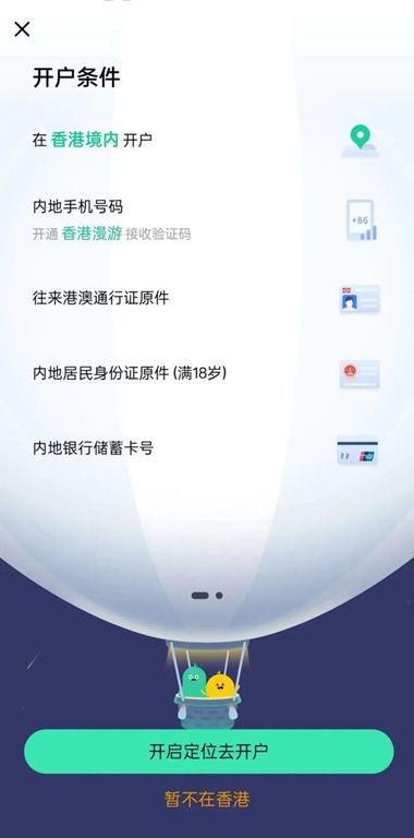 年满18周岁、有港澳通行证原件、开户时本人身处香港、可以接收短信的内地手机号、身份证原件、内地的银联卡(用于验证身份用)