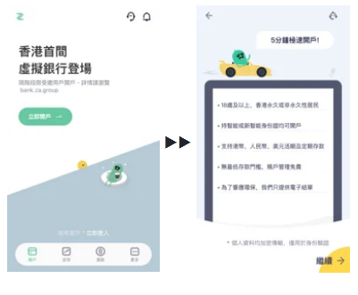 下載及開啟 ZA Bank App 就會見到兩隻「吉祥物」,行可愛活潑路線,介面簡潔,無多餘功能,按「立即開戶」,便會進入開戶程序。