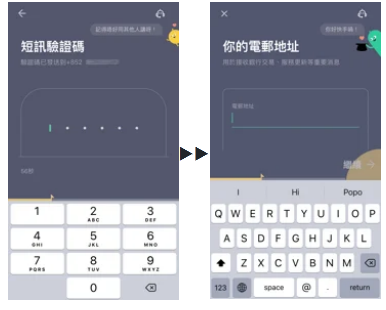 輸入手機號碼會即時收到短訊驗證碼,成功驗證後填電郵地址,供接收ZA Bank月結單之用。