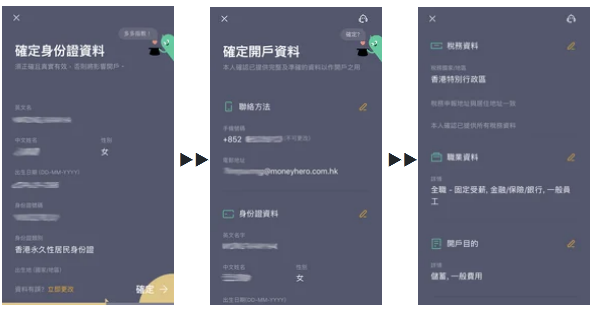 成功識別身份之後,個人資料會自動填好,再填聯絡方式、稅務資料及職業資料等。如果要交海外稅就記得要剔相關欄位。